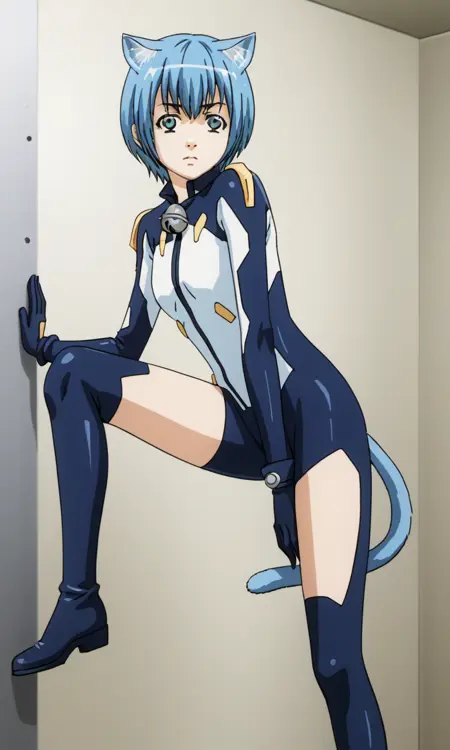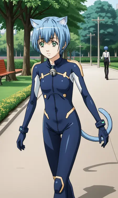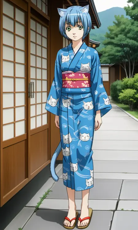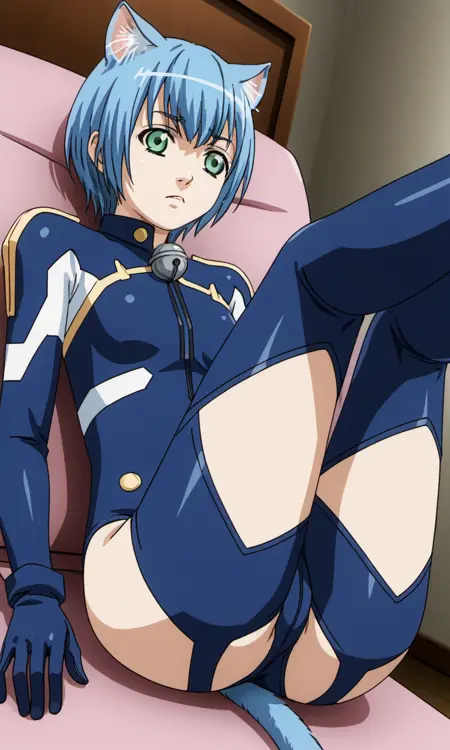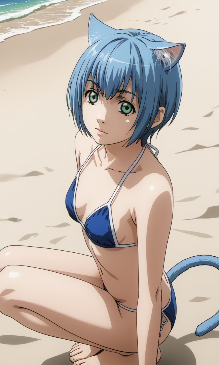 melvin, 1girl, green eyes, blue hair, short hair, cat ears, cat tail,