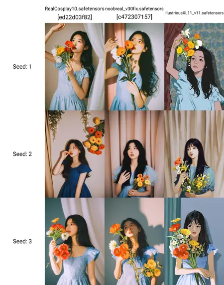 NoobAiが元々持っていたキャラクターと混合したい場合は、スタイルプロンプトを削除し、トリガーの重みを強める必要があります。例:(realistic,cosplay:1.5) 推奨ウェイトは1.0~1.5です。