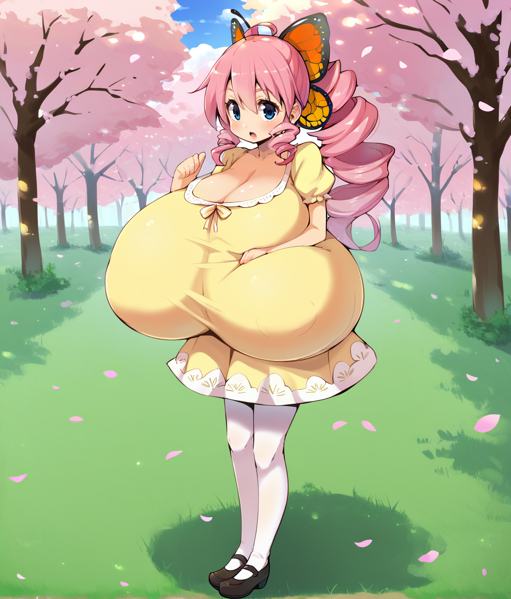 sakuraba himari,long hair,pink hair,breasts,white pantyhose,mary janes,blue eyes,yellow dress,short dress,butterfly hair ornament,drill hair,puffy short sleeves,cleavage,huge breasts