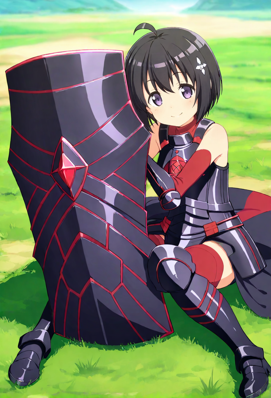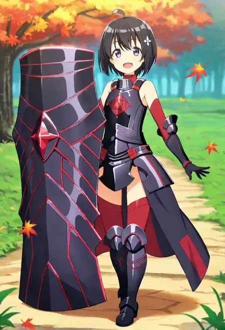 maple-default,maple \(bofuri\),보라색 눈,검은 머리,짧은 머리,아호게,머리 장식,검은 갑옷,분리된 소매,검은 장갑,갑옷 부츠,빨간 하의