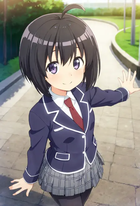 maple-schooluniform,maple \(bofuri\),보라색 눈,검은 머리,짧은 머리,아호게,교복,블레이저,빨간 넥타이,회색 치마,체크 치마,검은 팬티스타킹,로퍼