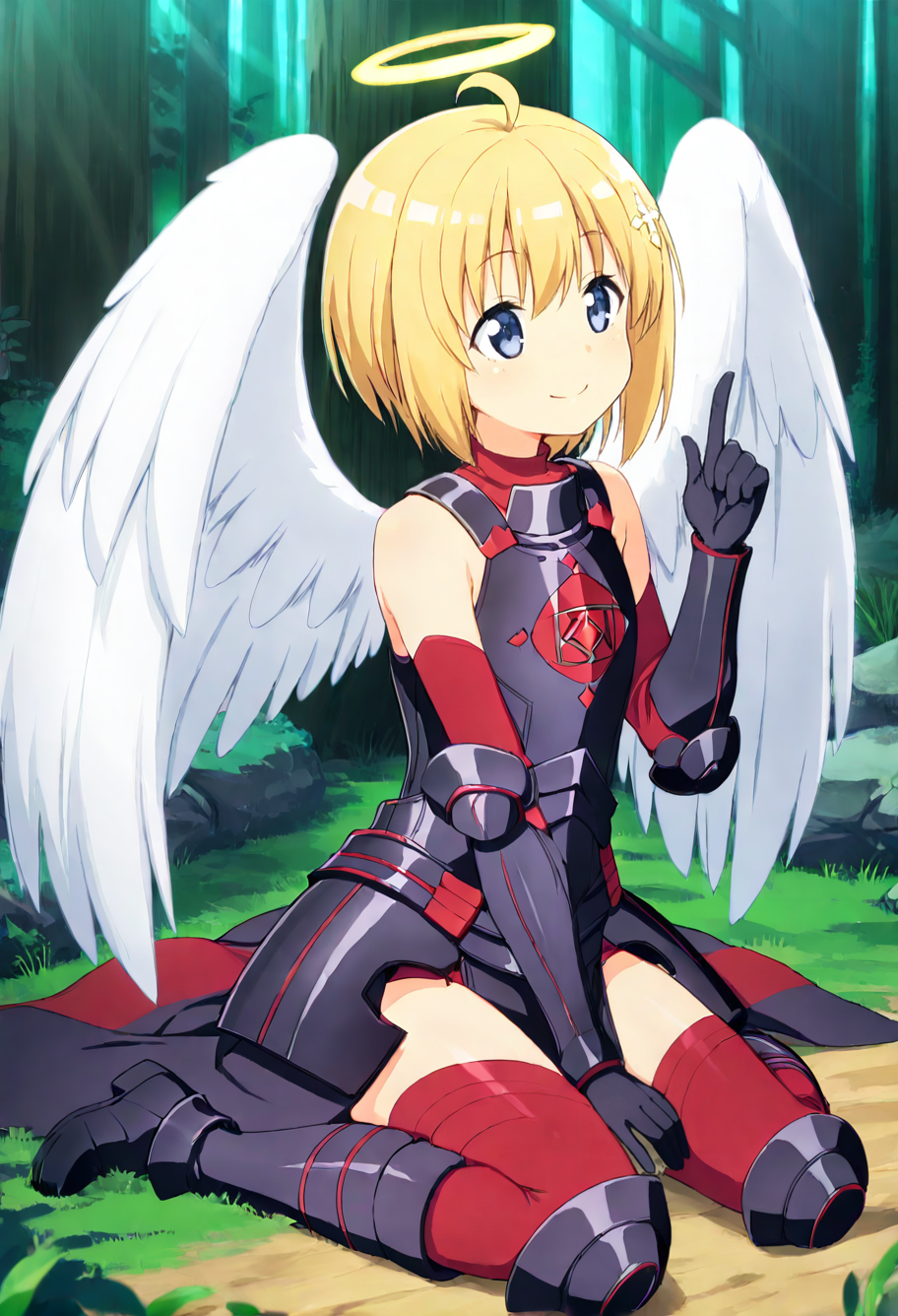 maple-default,maple \(bofuri\),파란 눈,블론드 머리,짧은 머리,아호게,머리 장식,할로,천사 날개,검은 갑옷,분리된 소매,검은 장갑,갑옷 부츠,빨간 하의