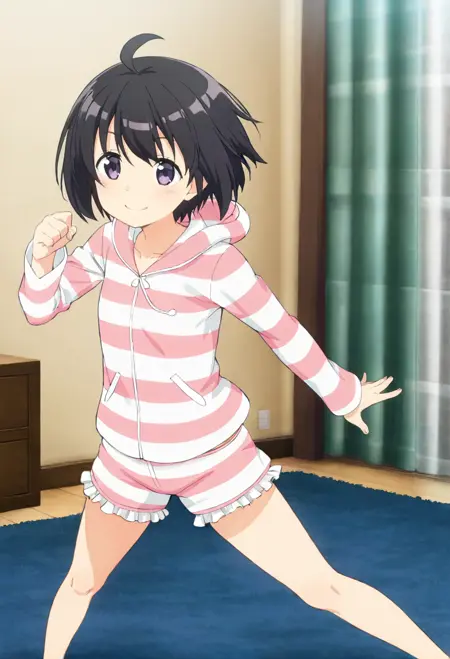 maple-pajamas,maple \(bofuri\),보라색 눈,검은 머리,짧은 머리,아호게,분홍 잠옷,줄무늬 후디,짧은 반바지,프릴이 달린 반바지