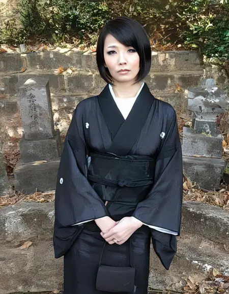 和服の喪服。日本の喪服は一般的に黒や薄墨色だが、和服の場合は喪主とその配偶者が白を着用することもある。