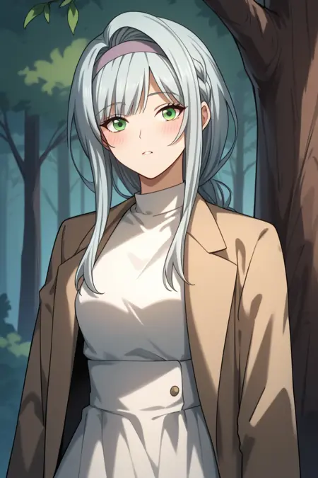 Qinqiu, Qiu2nd_dress, green eyes, grey hair, hair band, braid, white dress, brown coat