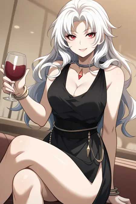 Seniwhite, Seni1st_dress, red eyes, white hair, long hair, necklace, choker, jewelry, black dress, sleeveless, cleavage, side slit