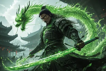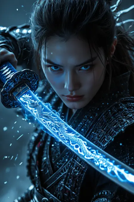 这个LoRA旨在生成带有发光龙刃太刀的酷炫武士!