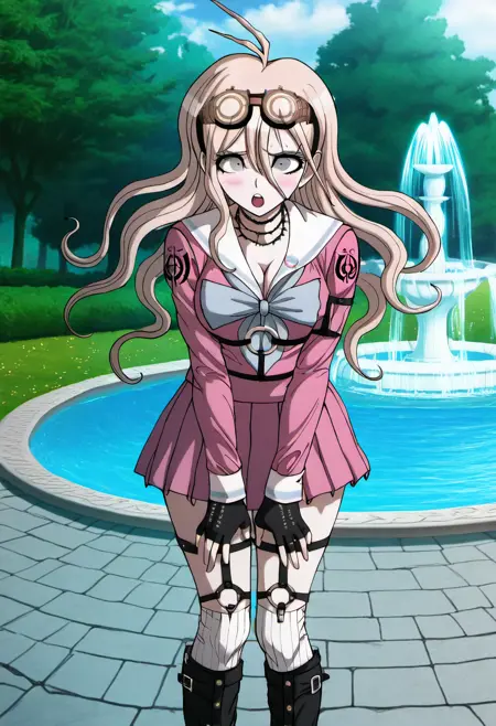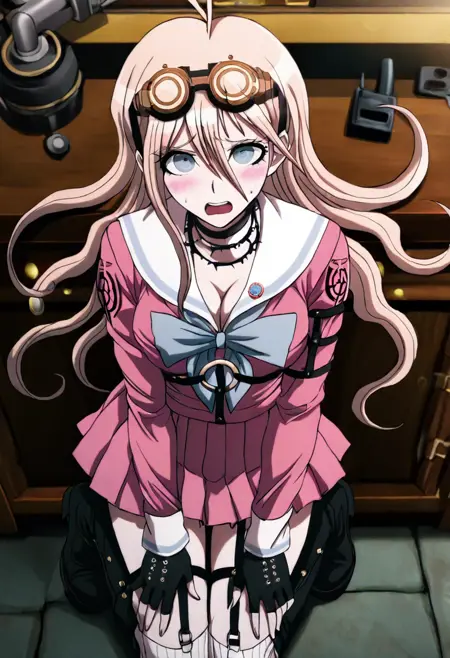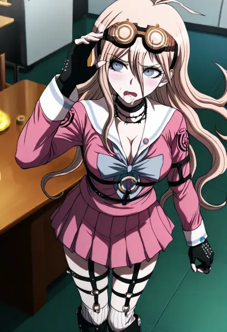 lora:Miu\_Iruma\_Illustrious:1, This is an anime screencap from Danganronpa 3. danganronpa_(series), danganronpa_v3:_killing_harmony, iruma_miu, Miu Iruma wearing her uniform from Danganronpa V3. Miu Iruma has waist-length strawberry blonde hair that flows in waves around her back, with two short locks of hair sticking up at the top of her head, sweeping to her right. Her bangs are long and wispy, swept somewhat to her left. She has ice-blue eyes. Her head accessories consist of a pair of brown goggles with gold accents. Miu wears a modified, long-sleeved, dark pink seifuku uniform with a white sailor collar and sleeve cuffs, both striped with a single faded pale blue line, a faded pale blue bow tied at her collar. Her chest cover is noticeably missing, her cleavage exposed. A crest can be found in black printed at the shoulders of her sleeves. She wears a short, dark pink pleated skirt the same color as her uniform, vertically striped off-white knee-high socks, and black heeled boots accented with gold buckles, studs, and buttons. Her accessories include a black choker, two rubber collars that resemble barbed wire, black fingerless gloves studded with silver, a pin of the mouse mascot from Niko Niko Happy on her collar, black straps connected with gold studs wrapping her left upper arm, and black straps studded with gold linked with gold rings around her torso and legs. Her long black boots reach nearly up to her knees. nervous expression Miu Iruma is in the Hope's Peak cafeteria drinking soda.