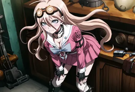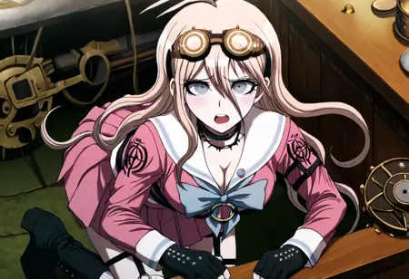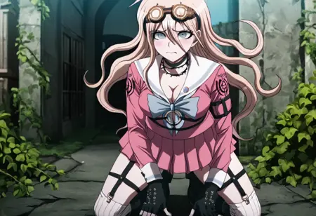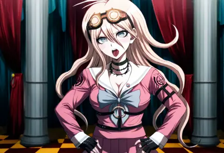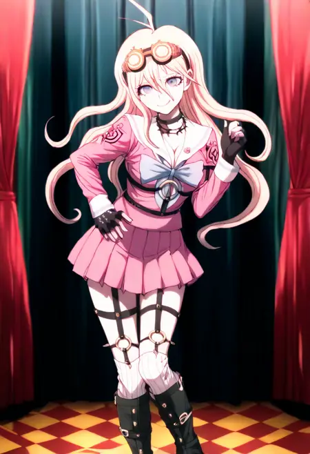 일반 복장: "Miu Iruma wearing her uniform from Danganronpa V3. Miu Iruma has waist-length strawberry blonde hair, ice-blue eyes, brown goggles, and dark pink seifuku uniform. She has a white sailor collar and sleeve cuffs striped with a pale blue line and pale blue bow at her collar. Her cleavage is exposed. A crest's on the shoulders of her sleeves. She wears a short, dark pink pleated skirt, vertically striped off-white knee-high socks, black heeled boots. Her accessories include a black choker, two rubber collars that resemble barbed wire, black studded fingerless gloves, a pin of the mouse mascot on her collar, black straps connected with gold studs wrapping her left upper arm, and black straps around her torso and legs. Her long black boots nearly reach her knees."