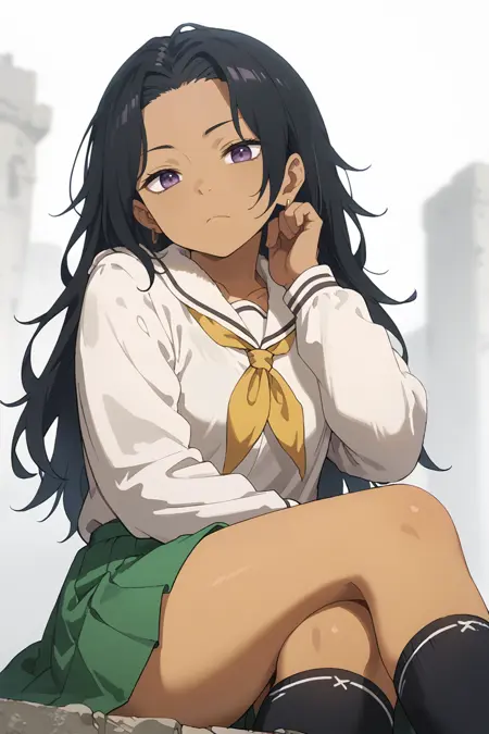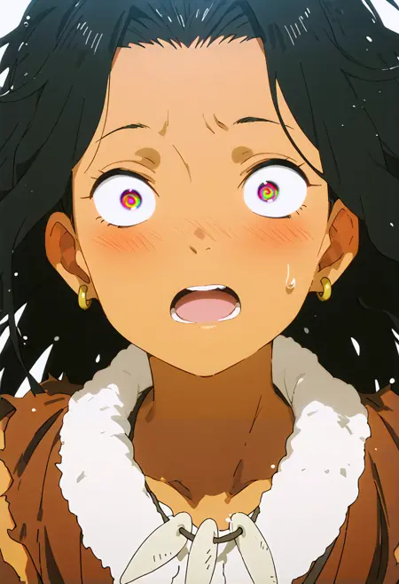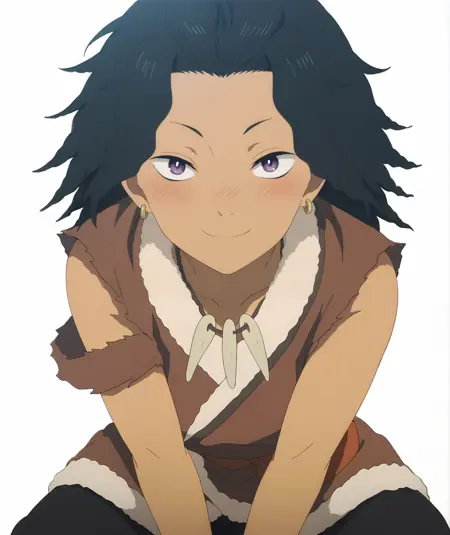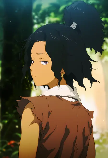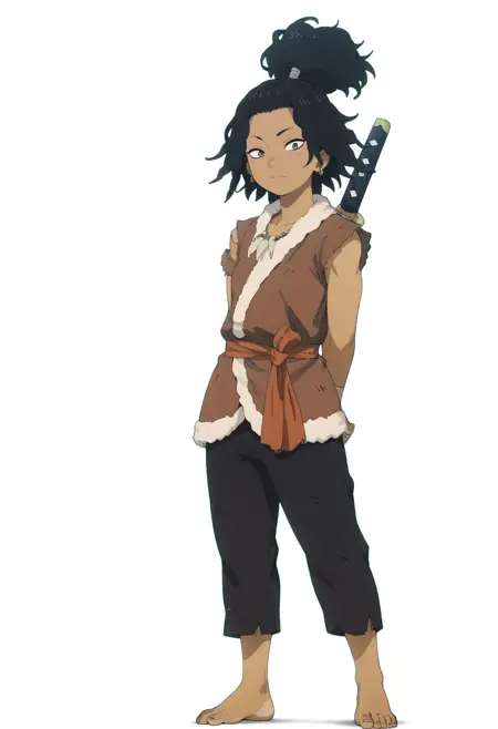 머리를 풀어낸 두 번째 모습; nurugai地獄楽, 귀걸이, 1소녀, 검은 피부, 검은 머리, 풀어낸 머리, 긴 머리, 귀걸이, 이빨 목걸이, 갈색 셔츠, 검은 바지, 카타나,