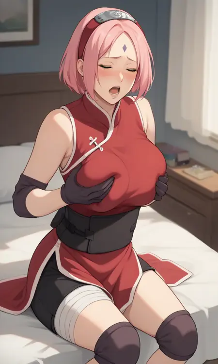 Trigger words: SakuraHaruno, pink hair, short hair, green eyes, forehead mark, qipao dress, black gloves, black obi, red hairband, forehead protector