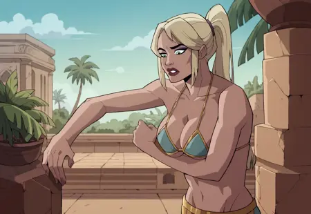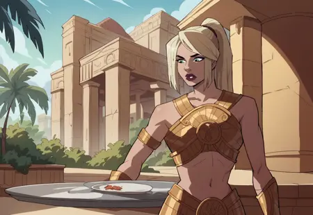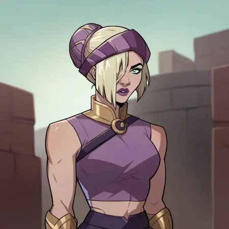 makeup, lipstick, short hair, blonde hair, hair bun, single hair bun, green eyes, hair over one eye, purple headband, purple crop top, sleeveless, purple skirt, bracers, Persephone (dc)