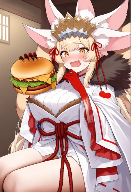 어둠 3단계 승격/야수: 금발 머리, 노란색 눈, 긴 머리, 낮은 트윈테일, 왕관, 여우 귀, 여우 꼬리, 추가 귀, 추가 꼬리, 일본 복장, 흰 키모노, 넓은 소매, 로프 벨트, 깃털 장식, 발톱, 손에 피, 탈리스만