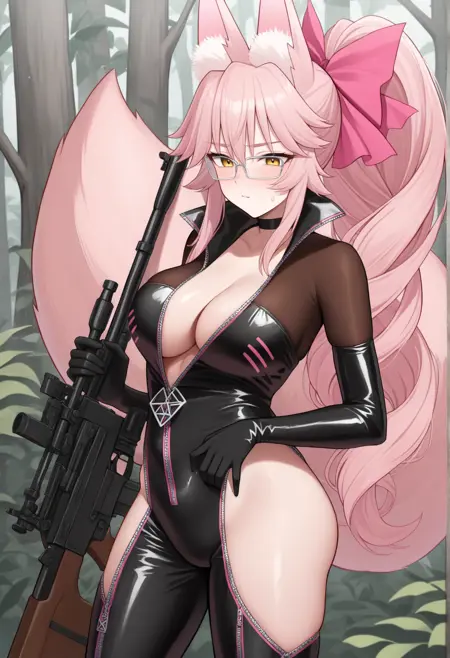빛 1단계 승격: 분홍색 머리카락, 긴 머리, 플레이타일, 노란색 눈, 여우 귀, 여우 꼬리, 분홍색 동물 귀, 분홍색 꼬리, 검정 바디수트, 초커, 언지ipped, 힙 벤트, 팔꿈치 장갑