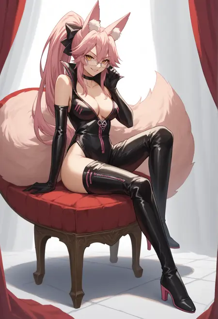 빛 1단계 승격: 분홍색 머리카락, 긴 머리, 플레이타일, 노란색 눈, 여우 귀, 여우 꼬리, 분홍색 동물 귀, 분홍색 꼬리, 검정 바디수트, 초커, 언지ipped, 힙 벤트, 팔꿈치 장갑