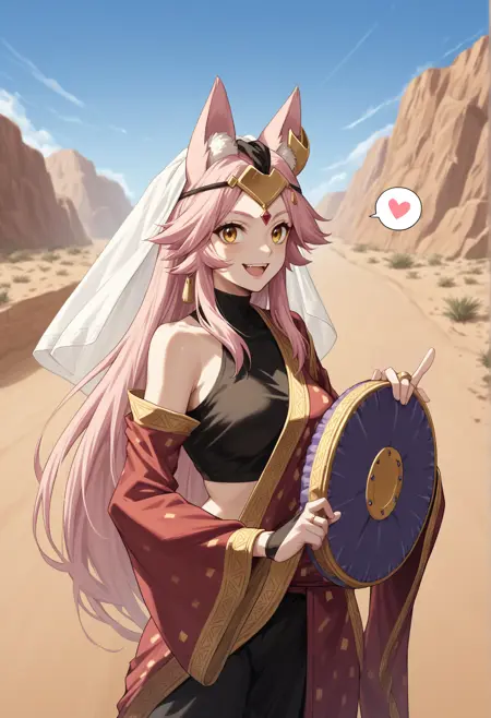 인도 손실belt: 긴 머리, 옆머리, 분홍색 머리카락, 노란색 눈, 여우 귀, 여우 꼬리, 분홍색 동물 귀, 분홍색 꼬리, 이마 보호대, 장신구, 보석, 반지, 인도 복장, 검정 결혼 장갑, 튜브 탑, 베일