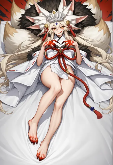 어둠 3단계 승격/야수: 금발 머리, 노란색 눈, 긴 머리, 낮은 트윈테일, 왕관, 여우 귀, 여우 꼬리, 추가 귀, 추가 꼬리, 일본 복장, 흰 키모노, 넓은 소매, 로프 벨트, 깃털 장식, 발톱, 손에 피, 탈리스만
