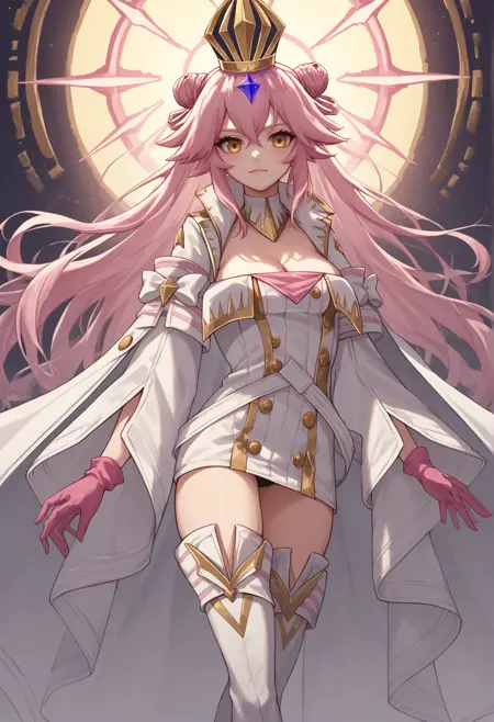 빛 3단계 승격: 긴 머리, 분홍색 머리카락, 노란색 눈, 더블 뭉치, 미트라, 흰 머리 장식, 짧은 드레스, 가슴 사이, 분리된 소매, 흰 코트, 넓은 소매, 분홍색 장갑, 허벅지 부츠