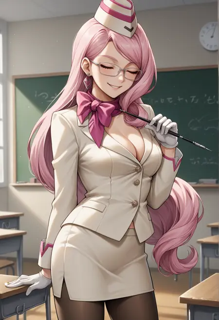 어둠 1단계 승격: 긴 머리, 분홍색 머리카락, 곱슬머리, 단일 옆머리, 귀걸이, 노란색 눈, 분홍색 스카프, 흰 블레이저, 흰 장갑, 가슴 사이, 연필 치마, 팬티후스, 가리슨 캡