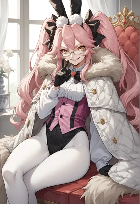 빛 2단계 승격: 분홍색 머리카락, 노란색 눈, 긴 머리, 트윈테일, 토끼 귀, 여우 꼬리, 검정 꼬리, 흰 블라우스, 리본 넥타이, 조끼, 레오타드, 흰 팬티후스, 검정 장갑, 털 장식된 망토
