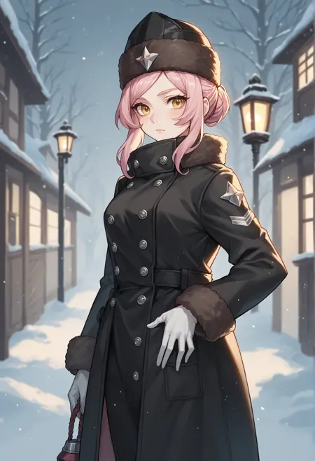 아나스타시아 손실belt: 분홍색 머리카락, 노란색 눈, 옆머리, 단일 머리 뭉치, 겨울 옷, 검정 코트, 털 장식된 모자, Lantern, 흰 장갑