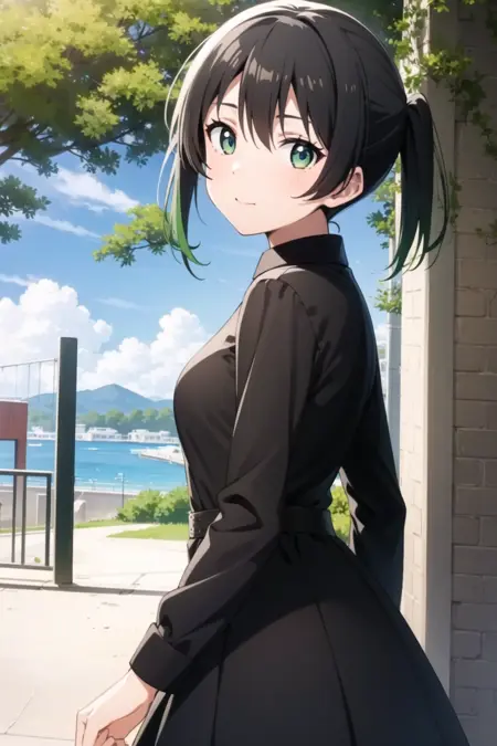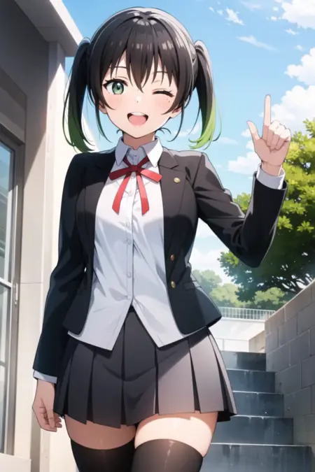 必要となるタグ:1girl, solo, takasaki yuu, twintails, green eyes, two-tone hair, black hair, short hair