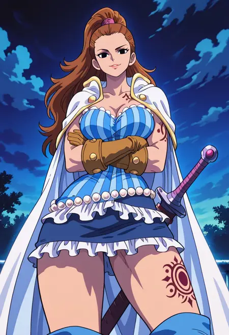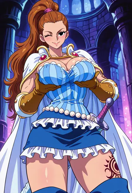 CharlotteCinnamonOP, 1girl, solo, 長い髪, 茶色の髪, 黒い目, ポニーテール, 高いポニーテール, 唇, 白いマント, 胸元, 大きな胸, 非常に長い脚, コルセット, タイムグラスボディ, 縞模様の青いコルセット, 短いフリルスカート, 茶色の手袋, 腰に差した剣, 左太ももの上部にタトゥー, 青いハイブーツ, ドレスの装飾, 真珠のベルト, 肘パッド, 太い太もも,