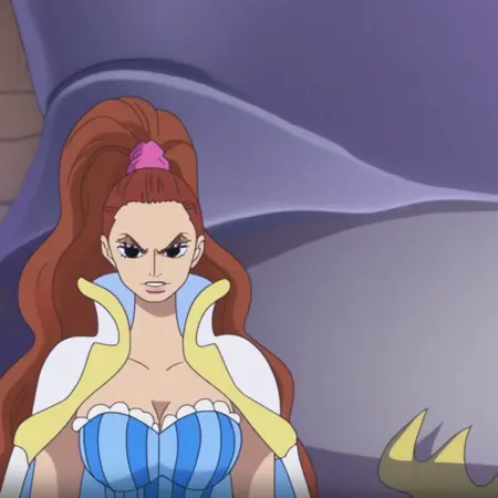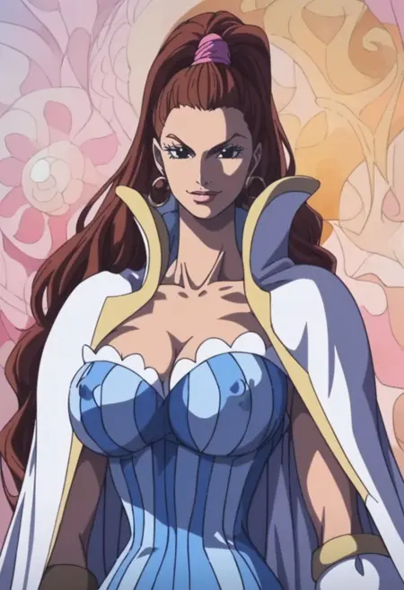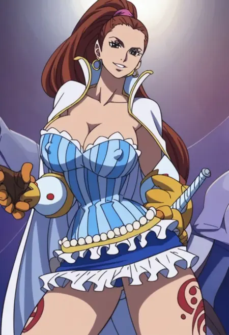 CharlotteCinnamonOP, 1girl, solo, long hair, brown hair, black eyes, ponytail, high ponytail, lips, white cape, cleavage, large breast, very long legs, corset, hourglass body, striped-blue corset, short frills skirt, brown gloves, sword on belt, tattoo on her upper left thigh, blue high boots, dress ornament, pearl belt, elbow padding, thick thighs,