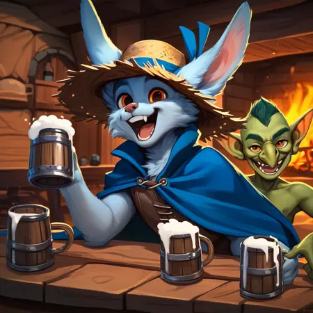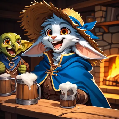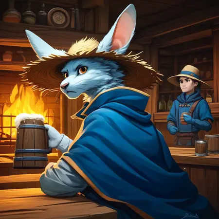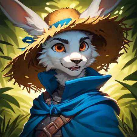 Prof_G_Quill, Anthro, solo, white rabbit, straw hat, blue ribbon, blue cape, smile,