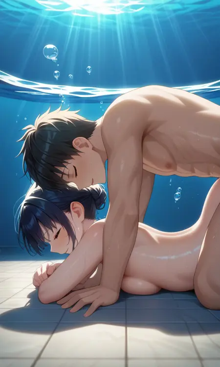_소년과 소녀가 아래를 향함, 소녀가 복부를 대고 누움, 소녀가 아래를 향함, 소녀의 기쁨的表情, 긴 머리, 하트 모양 눈, 벌어진 입, 머리를 뒤로 젖힘, 소녀의 손은 몸 옆에 곧게 뻗음,