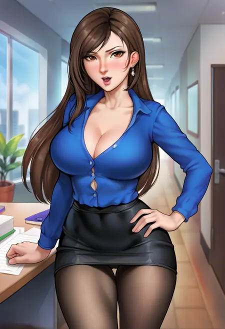 tifa, 1girl, brown hair, brown eyes, red eyes, swept bangs, lips, blunt bangs, long hair
