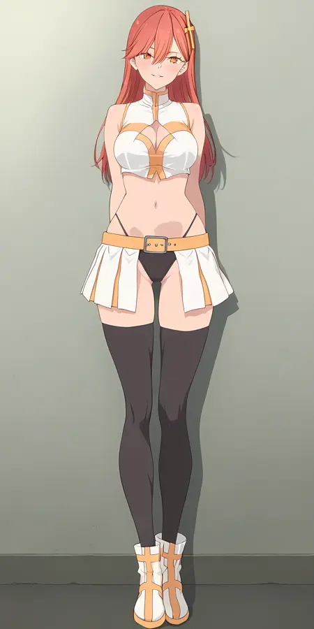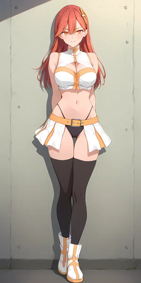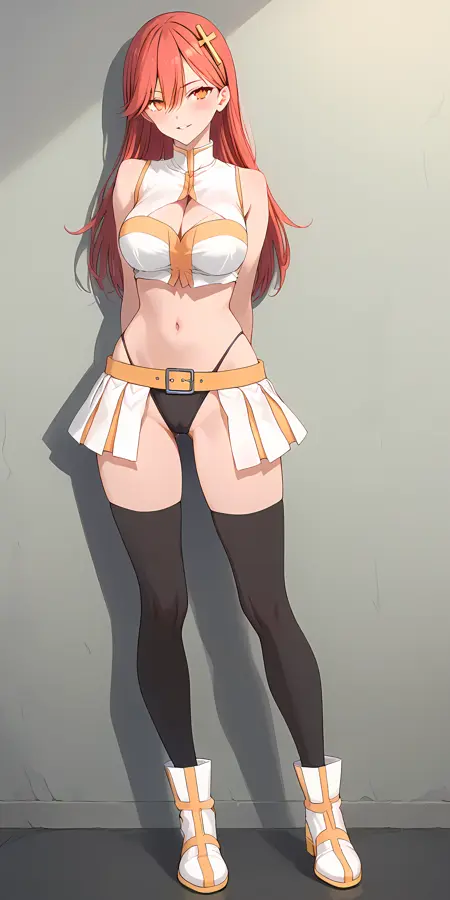 アリアコスプレ用アクティベーションタグ:aria_kisaki, 1girl, solo, arielform, red hair, orange eyes, long hair, large breasts, thighhighs, black thighhighs, navel, cleavage, underwear, panties, skirt, black panties, crop top, highleg, cleavage cutout, belt