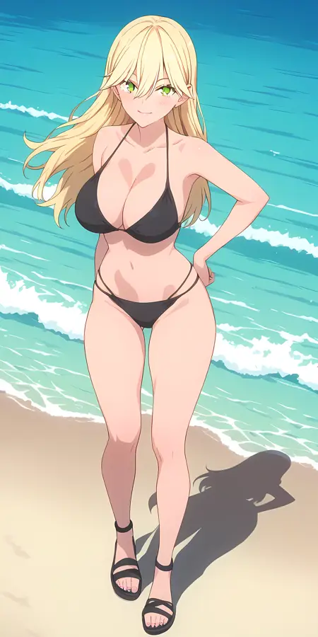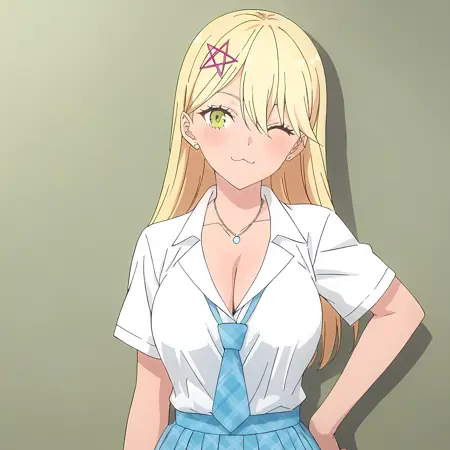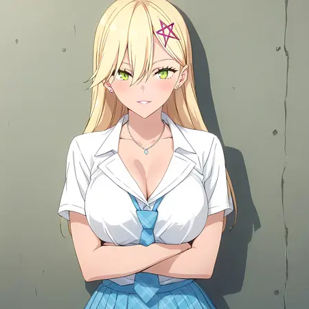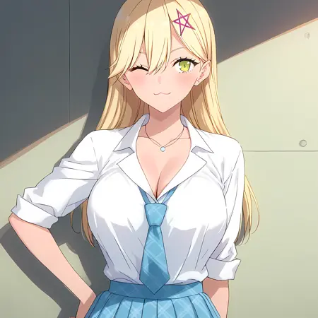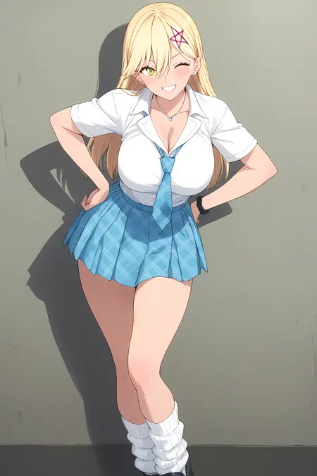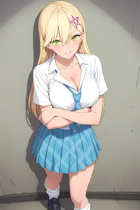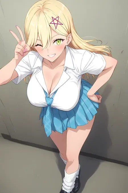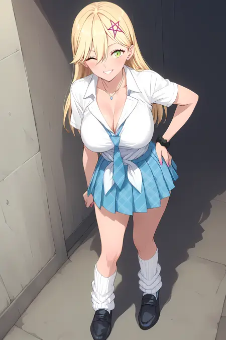 標準衣装のアクティベーションタグ:aria_kisaki, 1girl, solo, gyaru, blonde hair, green eyes, long hair, large breasts, cleavage, skirt, necktie, socks, loose socks, school uniform, shoes, white socks, blue necktie, white shirt, shirt, black footwear