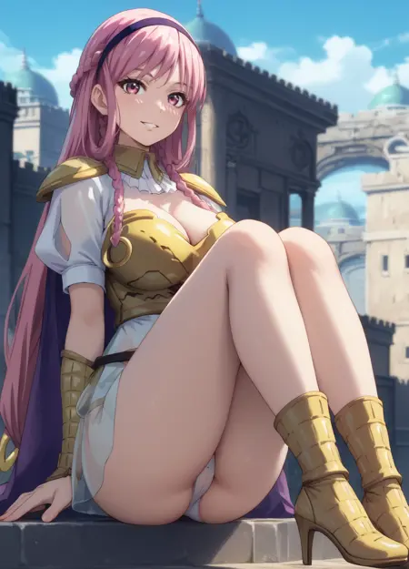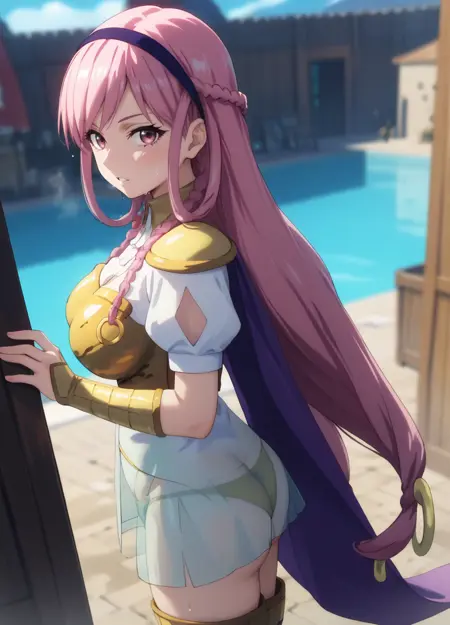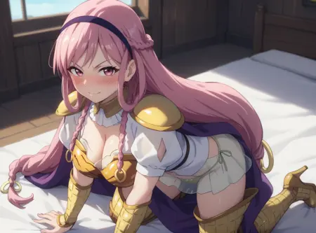 프롬프트: serendine, 분홍색 머리카락, 분홍색 눈, 긴 머리, 땋은 머리, 쌍 땋은 머리