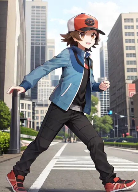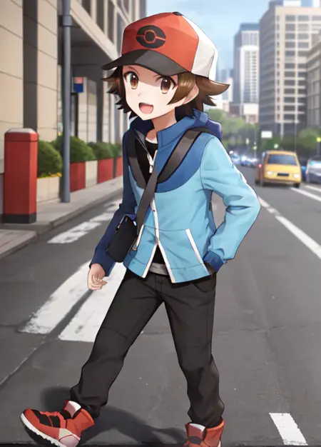 - Brown hair, brown eyes, red cap with a black brim, blue coat with long sleeves, black pants, red shoes