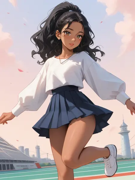 almond-shaped brown eyes, Long wavy black hair, tied in a high ponytail, medium tan, fitted white blouse with puffed sleeves,, tucked into a dark blue pleated skirt that reaches mid-thigh, mid-thigh dark blue skirt white sneakers, silver pendant necklace
