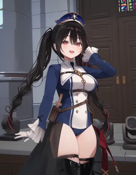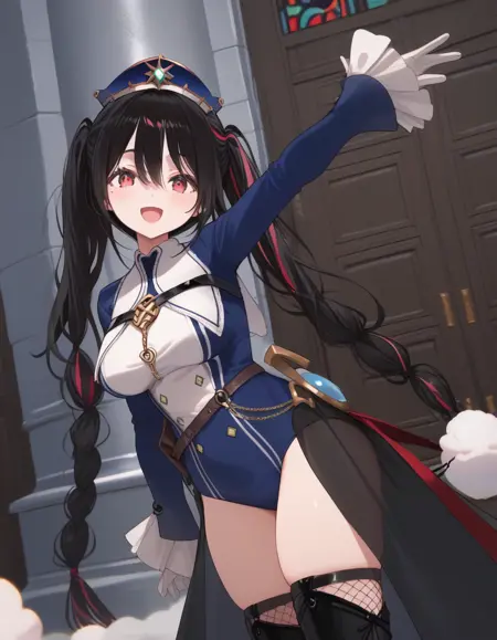 | 학습된 단어 | anshinin misa, black hair, very long hair, multicolored hair, two-tone hair, streaked hair, red hair, red eyes, twin braids, mole under eye, virtual youtuber, twintails, hair between eyes, large breasts, hair ribbon,복사됨! blue headwear, thighhighs, white gloves, boots, hat, thigh boots, black footwear, leotard, ribbon, thighs, black thighhighs, blue leotard, long sleeves, skindentation, showgirl skirt, belt,chest belt복사됨! |