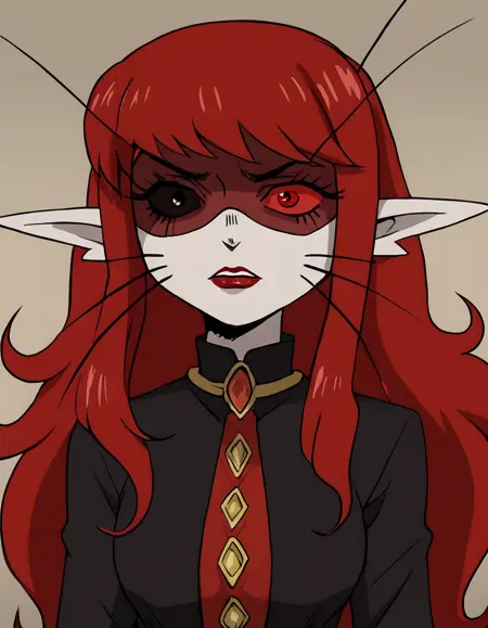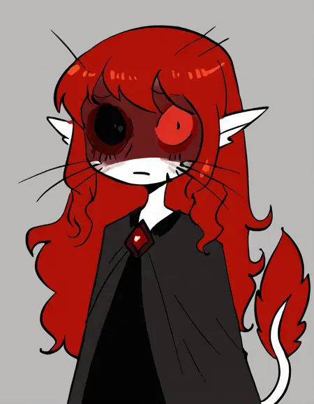 기본 태그; c1nnabar, 1girl, solo, ariral ears, ariral tail, ariral whiskers, red hair, long hair, white skin, colored skin, hair over eyes