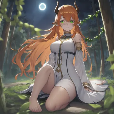 例: woman, decorated horns, long robes, fog, long curly hair, freckles, solo, masterpiece, reflective, depth of field, caustics, detailed night, forest, leaves, moonlight, eyes, orange hair, green eyes, vines