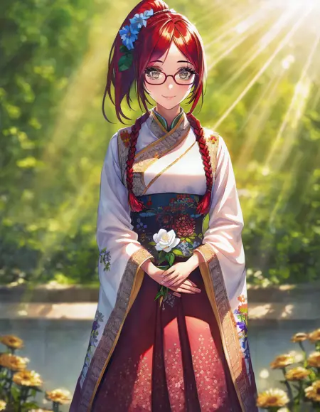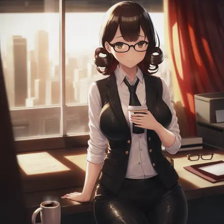 例: 1girl, solo, skirt, book, glasses, long hair, looking at viewer, bookshelf, jacket, plaid skirt, school uniform, long sleeves, parted lips, semi-rimless eyewear, bangs, blush, holding, blazer, indoors, sweater, under-rim eyewear, red-framed eyewear, holding book, brown eyes, library, sitting