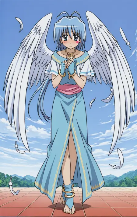 벨던디의 복장 (왜냐하면... 왜 안 될까요?)_: necklace, gold necklace, bracelets, gold bracelets, gloves, blue gloves, fingerless gloves, goddess dress, socks, fingerless socks, blue socks, anklets, gold anklets, angel, wings, angel wings, white wings