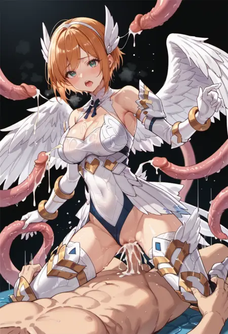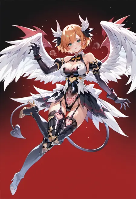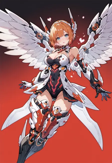 lumitea, wings, blue eyes, short hair, gloves, thighhighs, cleavage, blonde hair, feathered wings, angel wings, armor, bare shoulders, white gloves, elbow gloves, white wings, orange hair,
