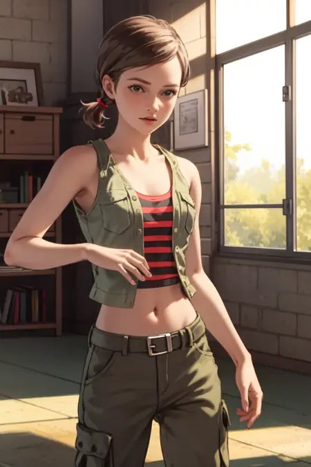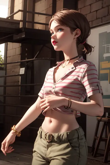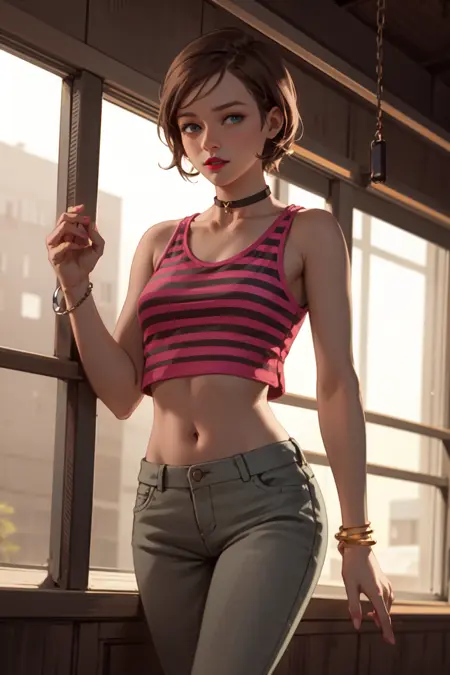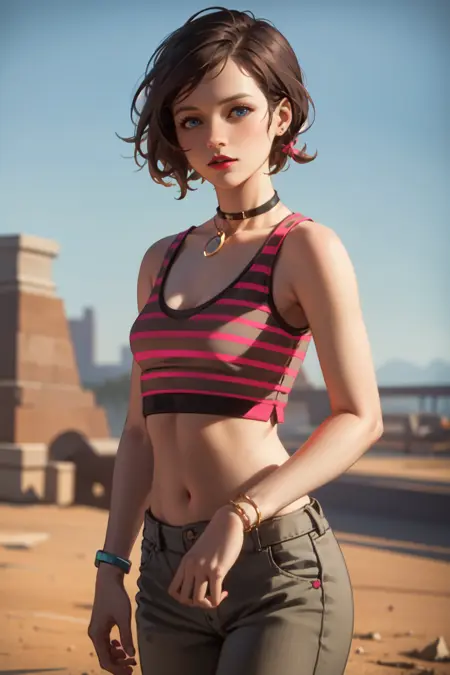 彼女のタンクトップは赤と黒のストライプ模様です。赤いタンクトップやストライプのタンクトップという記述はオリジナルデザインに近づきますが、プロンプトに「ストライプ」を含めると、他の衣類にもストライプが現れる可能性があるため注意してください。