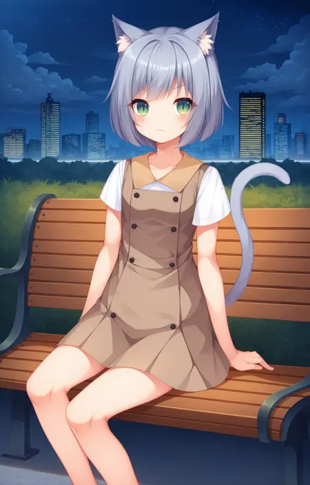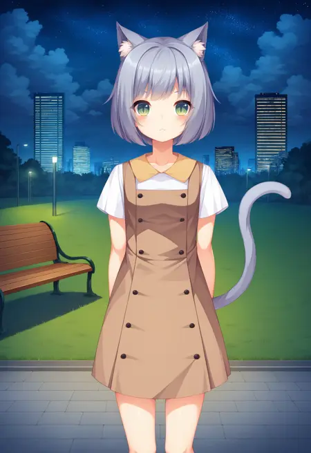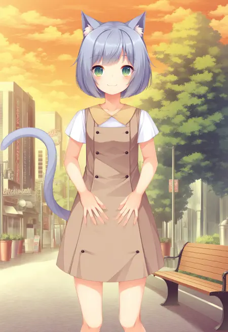 Miruku, short_hair, greyish_lavender_hair, green_eyes, blunt_bangs, cat_ears, animal_ear_fluff, cat_tail