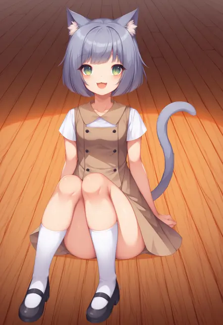 brown_pinafore_dress, Miruku, cat_ears, animal_ear_fluff, cat_tail, white_shirt, collared_shirt, short_sleeves, sleeveless_dress, buttons, short_dress, white_socks, shoes, mary_janes, black_footwear