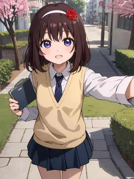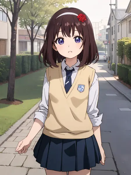 yaeno miho、紫の目、茶色の髪、中程度の髪、白いヘアバンド、髪の花