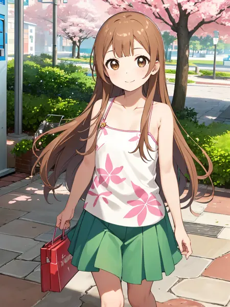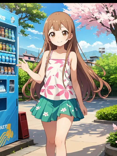 休闲装扮:oomuro hanako,棕色眼睛,棕色头发,长发及地(背心,花卉图案),绿色裙子,凉鞋