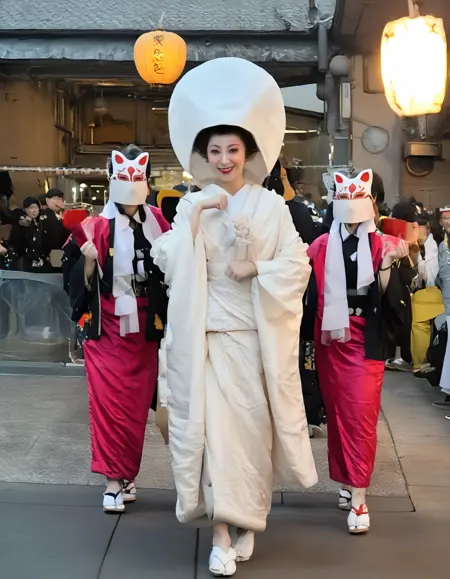 여우의 결혼은 일본 전역에 전해져 내려오는 전승이며, 여우로 분장한 신부가 거리를 행진하는 행사가 열린다. 횃불과 랜턴이 밝혀진 환상적인 분위기 속에서, 하얀 혼례복을 입고 여우 메이크업을 한 신부가 저녁에 시종들을 데리고 행렬을 이룬다. 최근에는 가고시마현의 번화가에서 매년 할로윈에 코스프레로 '여우의 결혼'이 등장하며 화제가 되고 있다.