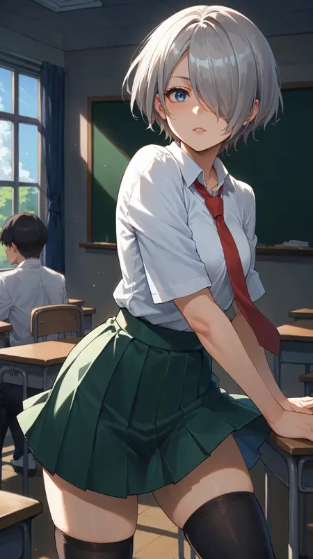 短发,灰发,头发遮住一只眼睛,蓝眼睛,黑色面罩,灰色长袍,白色毛边,黑白腰带,条纹腰带,长袖,宽袖,短袍,hsuit1,