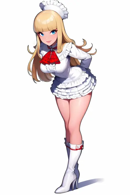 lilioutfit, blunt bangs, blonde hair, blue eyes, dress, frills, long sleeves, fingerless gloves, high heel boots, white footwear